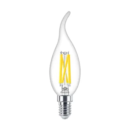 Die Mehrfachpackung 10x Philips MASTER LED E14 Gebogen-tip Kerze Fadenlampe Klar 3.4W 470lm - 922-927 Dim To Warm | Höchste Farbwiedergabe - Dimmbar - Ersatz Für 40W ist eine effiziente E14 LED-Lampe mit Retrodesign und der perfekte Ersatz für Ihre konventionellen 40W Lampen mit E14. Zudem strahlt sie Licht in der Farbtemperatur aus und punktet durch eine lange Lebensdauer.